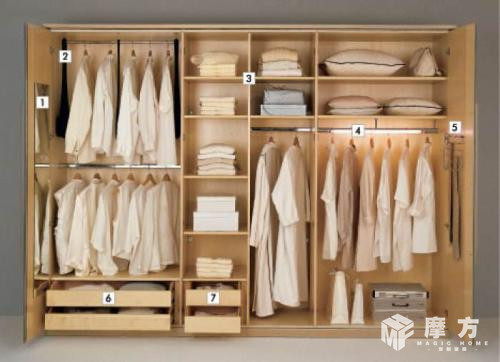 先來說說定制衣柜包括哪些空間,為了滿足各種服飾的收納,一般會設置掛衣區(qū),疊放區(qū),疊放儲存區(qū),抽屜,這四個區(qū)間是最基本的,每個衣柜都會配備。