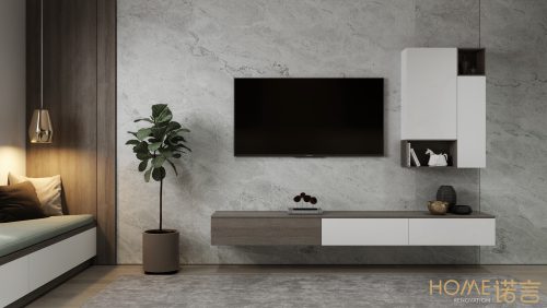 吊柜與懸柜組合,讓客廳整潔美觀,性價比高又不失大氣。整面墻的設計簡潔高級。柜體暗灰色木質搭配雅典白的門板,有著輕奢的質感。