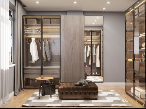 由于玻璃的通透性能,其衣柜內(nèi)的不整齊則會非常明顯地就被看到,從而也會影響到衣柜所在空整齊度,這樣就會讓空間在視覺上產(chǎn)生一種“亂”的現(xiàn)象,所以如果追求隱私可以局部添加玻璃柜門,不僅可以作為展示功能,同時還能避免積灰。